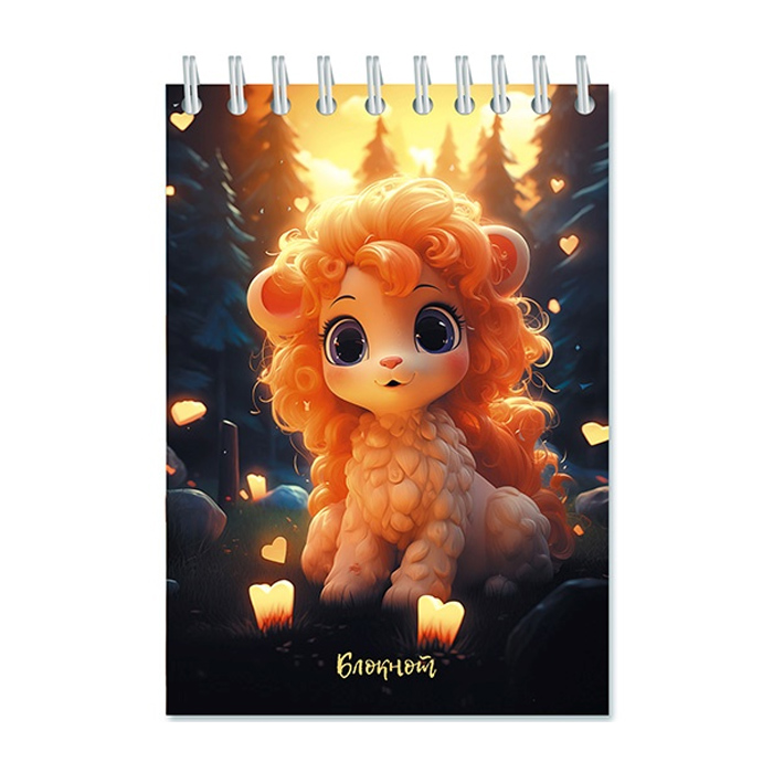 Блокнот на гребне, 48 листов, формат А6, клетка, плотность 60 гр/м2. Внутренний блок - высококачественная белая офсетная бумага. Обложка - мелованный картон, полноцветная печать с лакированием блестками. Крепление - металлическая евроспираль сверху.