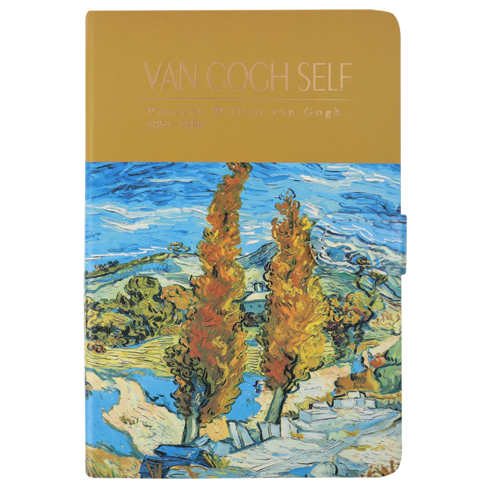 Блокнот на магнитной застежке с цветным срезом 13*19см. Закладка-ляссе. Офсет, 112л в линейку. Плотность не менее 100г/м2. Изображение с картины Винсент ван Гога " Два тополя по дороге к холмам " 1890г.Упаковка: плёнка.