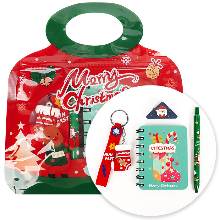 Набор подарочный новогодней тематики. Комплектность: блокнот на спирали (8*10,5см, кол-во листов-80, графление-линейка), ручка автоматическая, зажим,брелок. Упаковка: пакет в виде сумочки с zip-lock 20,5*21,5*1см
