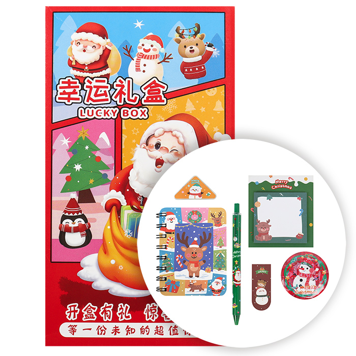 Набор подарочный новогодней тематики. Комплектность: блокнот на пружине (8*10,5см, кол-во листов-80, графление-линейка), ручка автоматическая, зажим, закладка, набор стикеров (6*6, 30шт). Упаковка: картонная коробка 8,5*15*4см.