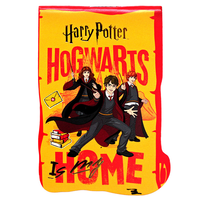 Блокнот фигурный "Гарри Поттер". Мини-формат А7 позволит держать блокнот всегда при себе и делать записи в любой подходящей обстановке. Внутренний блок без линовки и картонная обложка скреплены с помощью металлической скобы. Высокое качество цветопередачи обеспечивает яркое и четкое несение изображения. Тиснение золотой фольгой, эффектно подчеркивает дизайн. Объем – 40 листов.