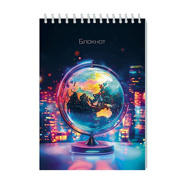 Блокнот на гребне, 32 листа, формат А5, клетка, плотность 60 гр/м2. Внутренний блок - высококачественная белая офсетная бумага. Обложка - мелованный картон, полноцветная печать. Крепление - металлическая евроспираль сверху.