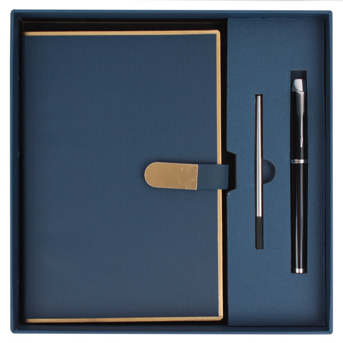 Ежедневник недатированный с магнитной застёжкой , цветной срез. Закладка ляссе. Размер - 14,5*21 см. Графление- линейка. Количество листов-96.  Цвет-синий с золотой каймой. Ручка капиллярная+стержень. Цвет чернил: чёрный. Упаковка-подар. кор. +пакет.23,5*4*23,5см.