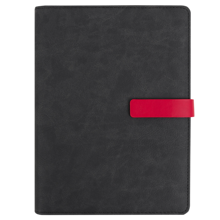 Ежедневник недатированный , размер:17,5*23см , обложка -кожзам , на кольцах и магнитной застёжке, внутри с дополнительными карманами количество листов -100, графление-линейка, размер внутреннего блока -14*21см. Цвет: черный/красный. Упаковка: мешок текстиль 20*25*3,5см