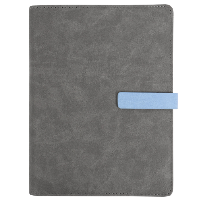 Ежедневник недатированный , размер:17,5*23см , обложка -кожзам , на кольцах и магнитной застёжке, внутри с дополнительными карманами количество листов -100, графление-линейка, размер внутреннего блока -14*21см. Цвет: серый/голубой. Упаковка: мешок текстиль 20*25*3,5см