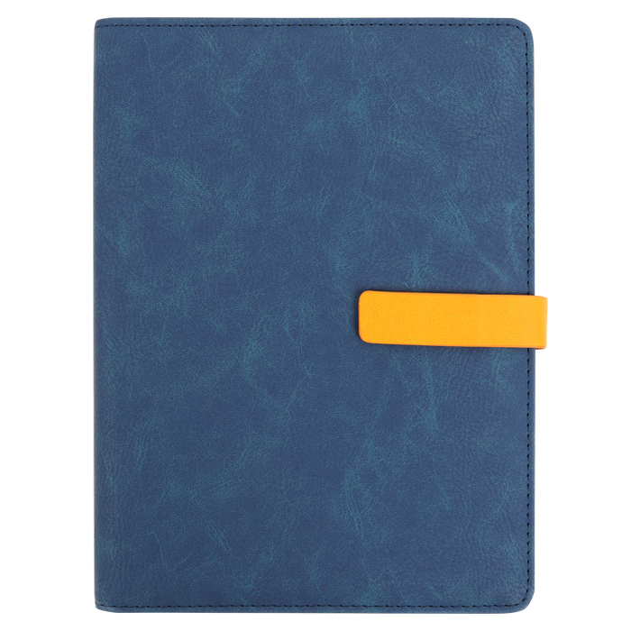 Ежедневник недатированный , размер:17,5*23см , обложка -кожзам , на кольцах и магнитной застёжке, внутри с дополнительными карманами количество листов -100, графление-линейка, размер внутреннего блока -14*21см. Цвет: синий/желтый. Упаковка: мешок текстиль 20*25*3,5см