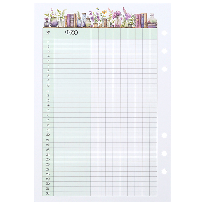 Сменный блок из белой бумаги с 6 отверстиями для учителя со списком учеников для оценок. Удобный разворот с нумерацией на втором листе. Хватит даже на большой класс - 32 ученика.