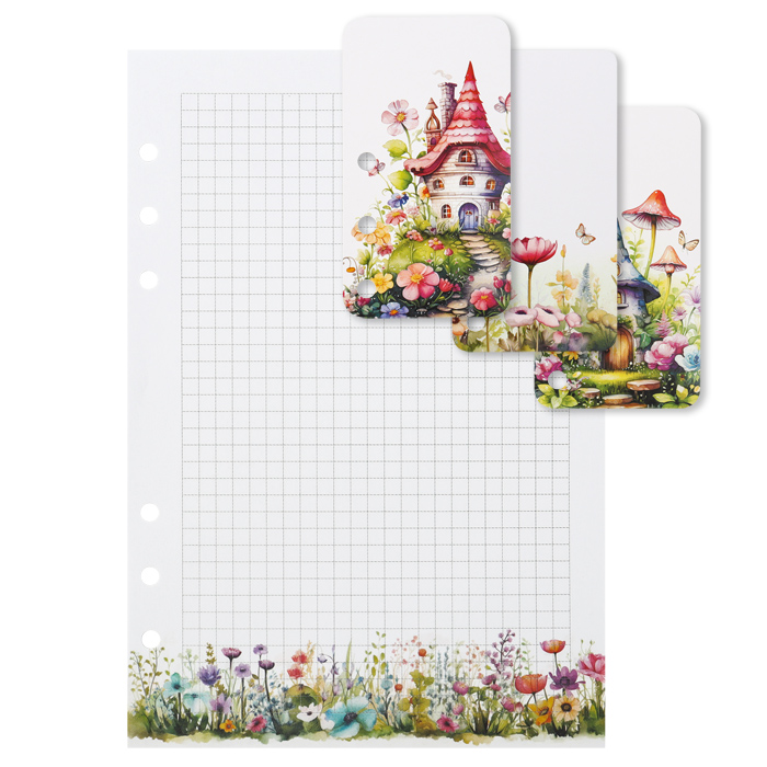 Сменный блок из белой бумаги с 6 отверстиями в клетку с цветной печатью - цветочная поляна + 3 цветных разделителя