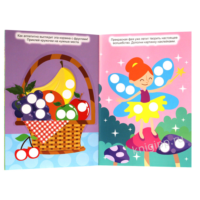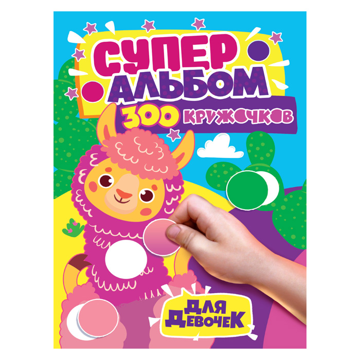 Супер альбом с кружочками поможет занять ребёнка действительно надолго! Ведь в нём около 300 наклеек, которые нужно разместить в соответствующих местах брошюры. Ребёнку непременно захочется заполнить цветными кружочками яркие сюжетные картинки.
