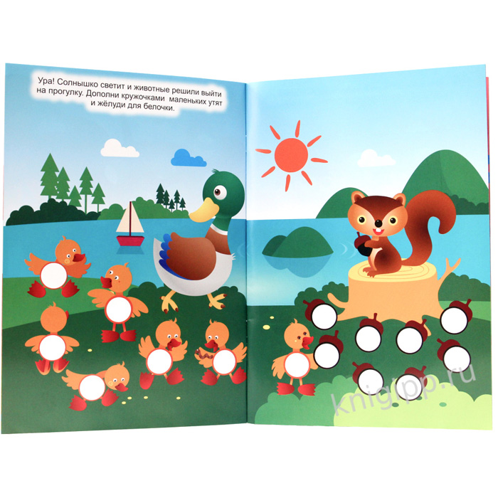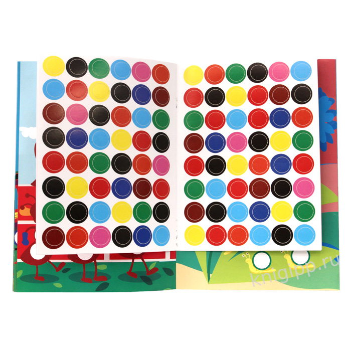 Супер альбом с кружочками поможет занять ребёнка действительно надолго! Ведь в нём около 300 наклеек, которые нужно разместить в соответствующих местах брошюры. Ребёнку непременно захочется заполнить цветными кружочками яркие сюжетные картинки.