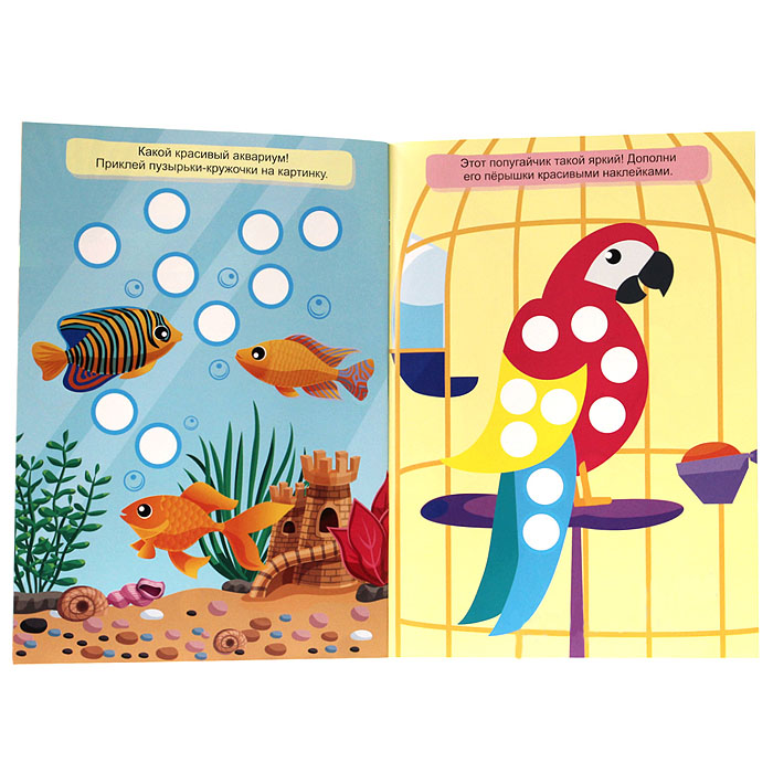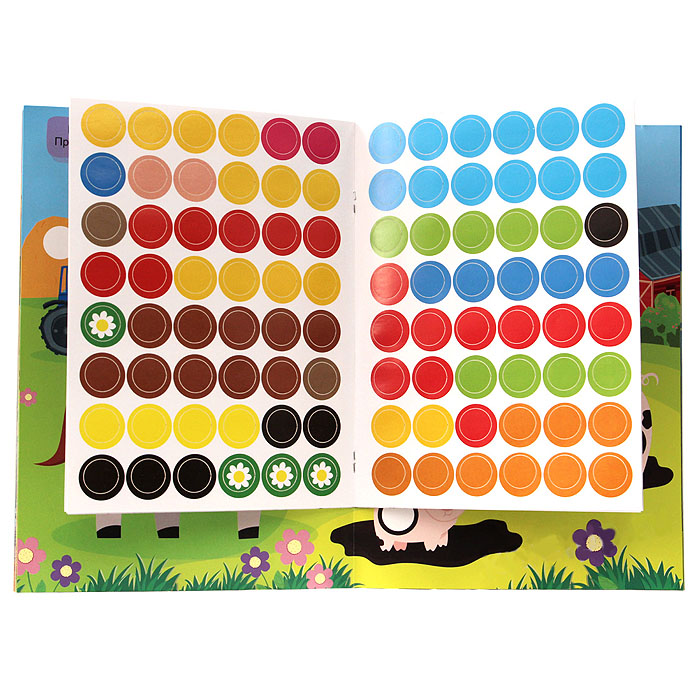 Супер альбом с кружочками поможет занять ребёнка действительно надолго! Ведь в нём около 300 наклеек, которые нужно разместить в соответствующих местах брошюры. Ребёнку непременно захочется заполнить цветными кружочками яркие сюжетные картинки.