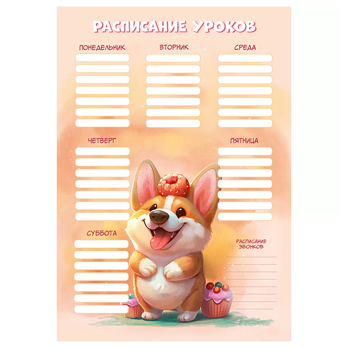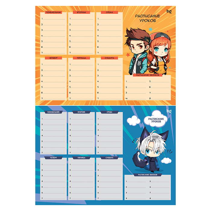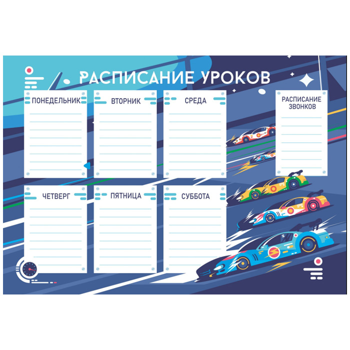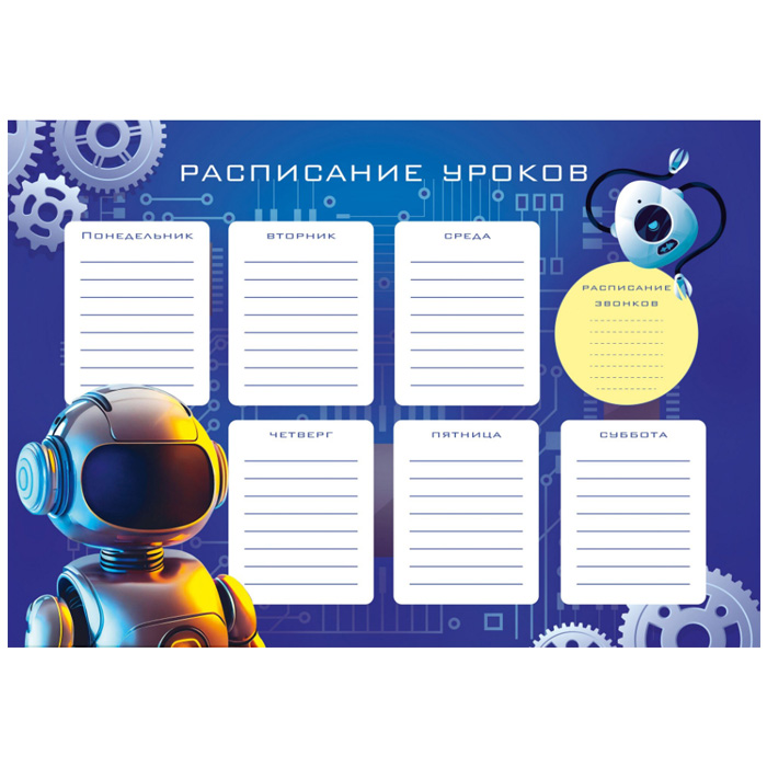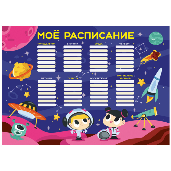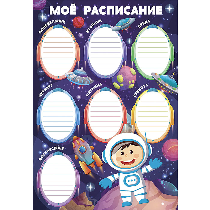 Удобные бланки расписания для школьников формата А4 можно приклеить на стену или разместить на письменном столе. Так план на день всегда будет находиться перед глазами у ребенка. Многообразие ярких моделей с изображением героев популярных мультфильмов, картинками и узорами позволяет подобрать подходящий вариант для девочек и мальчиков любых возрастов. Каждый из дней недели в расписании разделен на 7 или 8 нумерованных строк для заполнения уроков.