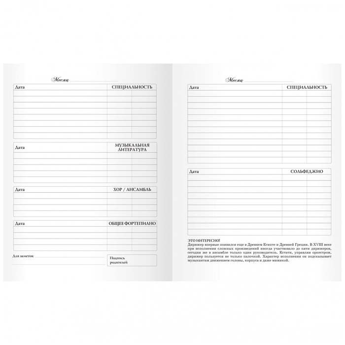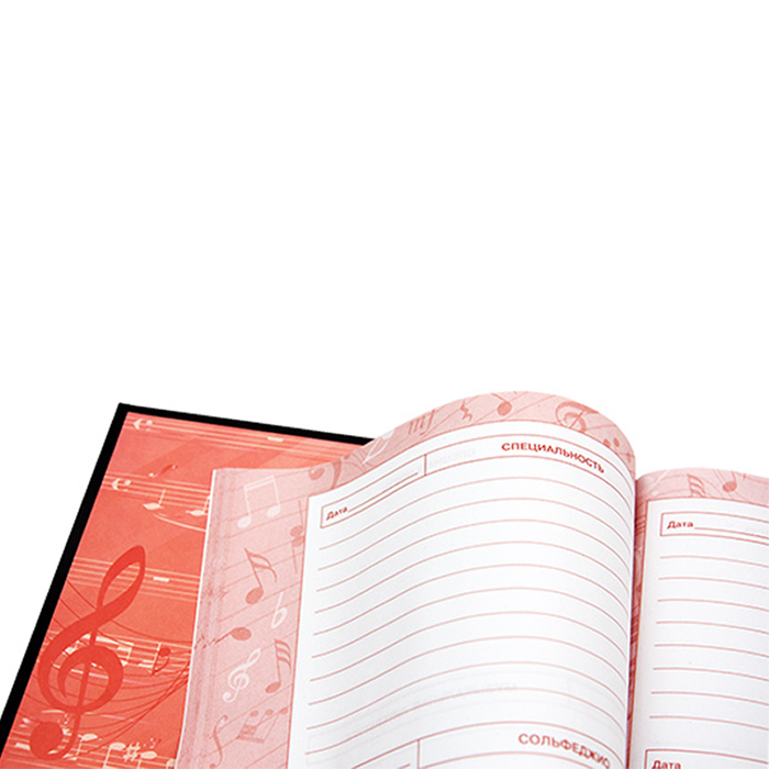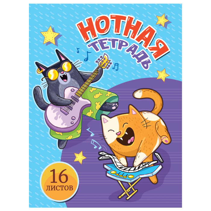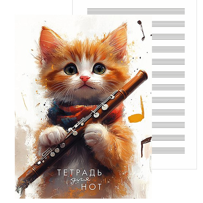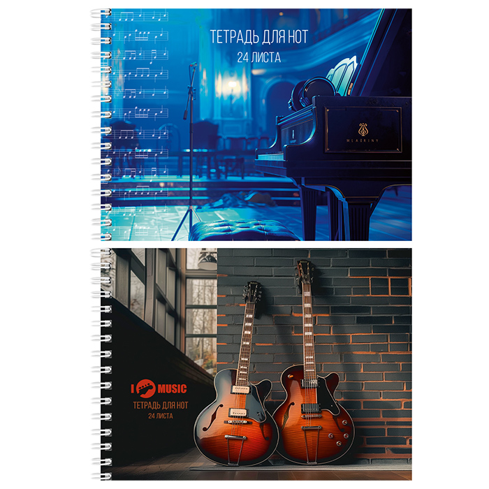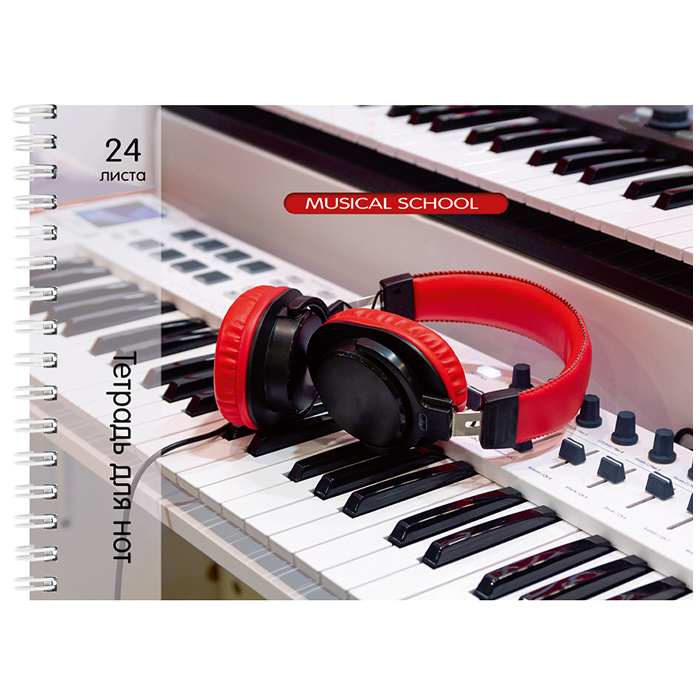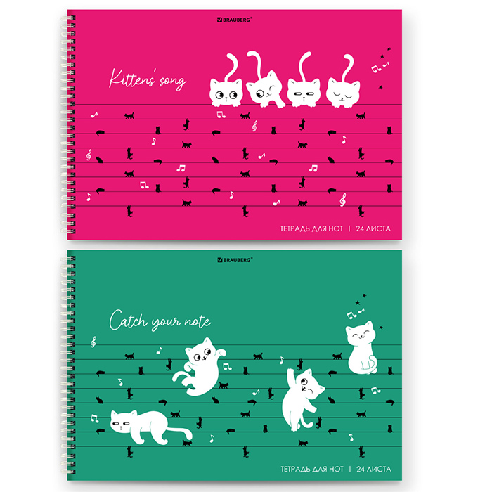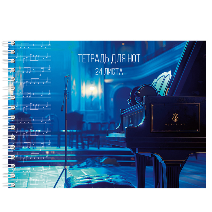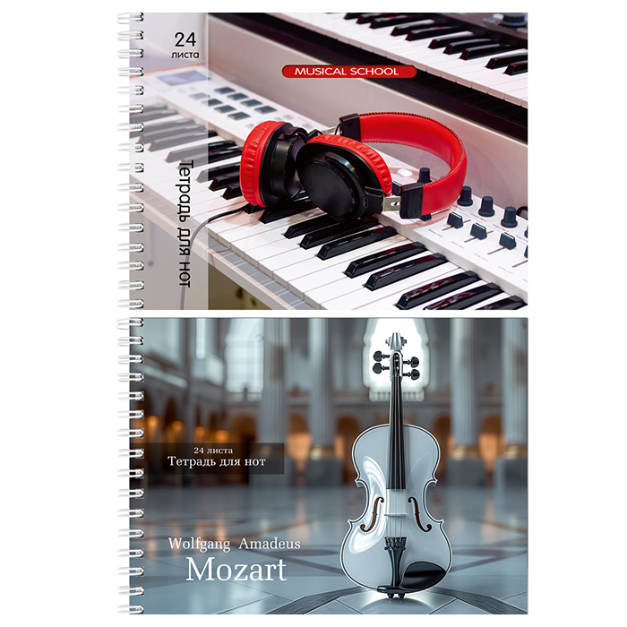 В каталоге представлены нотные тетради для занятий музыкой с тематическими рисунками на обложках. Варианты на 16 или 24 листа надежно скреплены скобами.