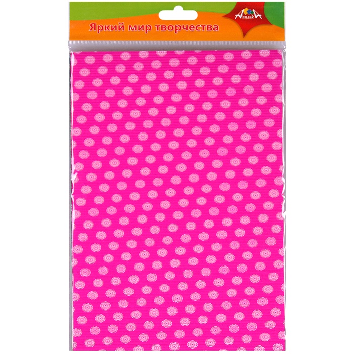 Цветной гофрированный картон с рисунком 5 листов, 5 цветов ТМ Апплика. Листы гофрированного картона, окрашены в разные цвета, с белыми рисунками по цвету. В ассортименте рисунки: звездочки, кружочки, бабочки, цветочки, и цвета: синий, зеленый, красный малиновый, желтый. В наборе один вид рисунка на 5 листах разного цвета. Гофрированный картон великолепный материал для детского творчества. Он придает аппликациям объем и глубину. Легко режется ножницами и клеится. Упаковка - пакет с европодвесом. Набор предназначен для детей от 3-х лет.