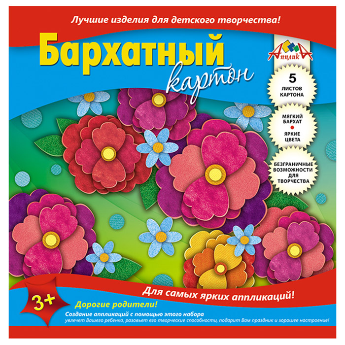 Цветной бархатный картон 5 листов, 5 цветов. В наборе представлены цвета: красный, синий, зеленый, желтый, черный. Бархатный картон отлично подойдет для аппликаций, открыток и реализации других творческих идей. Набор упакован в папку из мелованного картона, что позволяет хранить листы в порядке.