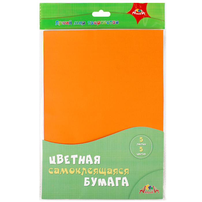 Цветная самоклеящаяся бумага, 5 листов, 5 цветов, формат А4, плотность 190 гр/м2. Внутренний блок - мелованная бумага с клеевым слоем. В наборе цвета: зеленый, оранжевый, желтый, синий, красный. Упаковка - ПЭТ-пакет с европодвесом.