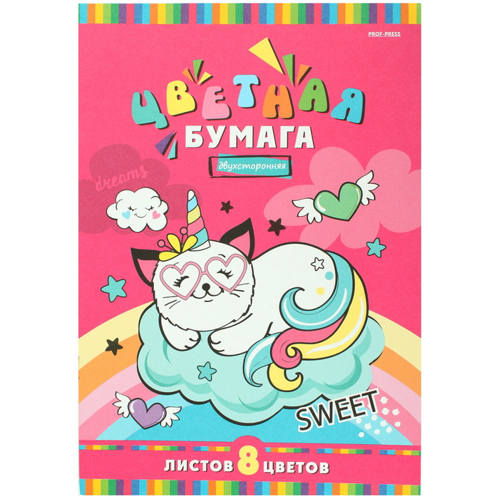 Бумага цветная двухсторонняя А4 8л. 8цв. "Странный котик-2" на скобе