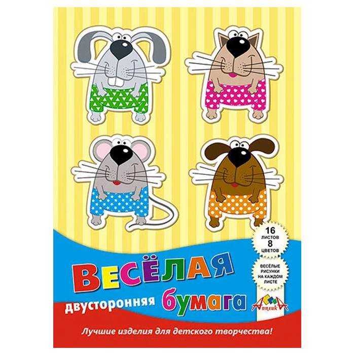 Цветная двусторонняя бумага с рисунком, 16 листов, 8 цветов, формат А4, плотность 50 гр/м2. Внутренний блок - офсет №2. В наборе каждый лист с одной стороны окрашен в цвет, а на обороте нанесен рисунок: розовый/треугольники, голубой/звездочки, синий/горошек, желтый/цветочки, оранжевый/ромбики, черный/полоски, зеленый/косые полоски, красный/cердечки. Крепление - скоба, обложка - офсетная бумага. Рекомендуется детям от 3 лет.