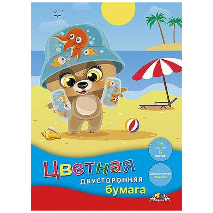 Бумага цветная двухсторонняя А4 16л. 8цв. "Щенок на пляже"