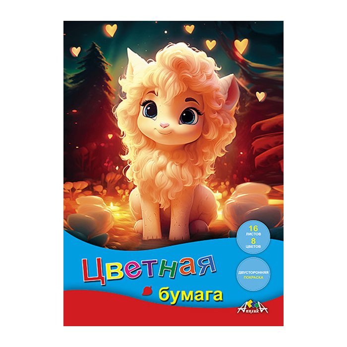 Цветная двусторонняя бумага, 16 листов, 8 цветов, формат А4, плотность 50 гр/м2. Внутренний блок - офсет №2, двойной прокрас с двух сторон. В наборе цвета: красный, желтый, синий, черный, фиолетовый, оранжевый, зеленый, коричневый. Крепление - скоба, обложка - офсетная бумага.