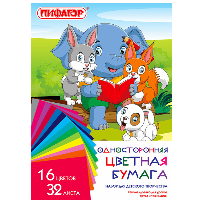 Набор односторонней цветной бумаги плотностью 50 г/м2 включает 32 листа формата А4 (200х280 мм) в 16-и разнообразных и насыщенных однородных цветах. Листы скреплены скобами, легко режутся и сгибаются.