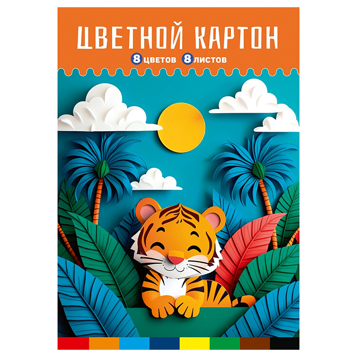 Картон цветной А4 8л. 8цв. "Тигрёнок в джунглях" в папке
