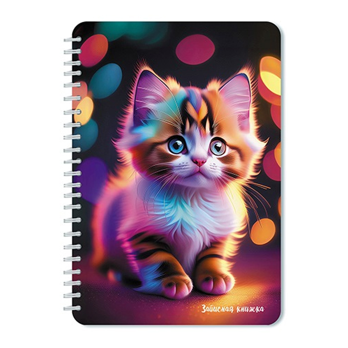 Записная книжка, 40 листов, формат А5, клетка, плотность 60 гр/м2. Внутренний блок - высококачественная белая офсетная бумага. Обложка - мелованный картон, полноцветная печать с защитным ВД-лаком. Крепление - металлическая евроспираль сбоку, по длинной стороне.