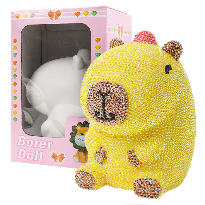 Копилка декоративная. Комплектность: фигурка-копилка, разноцветные стразы, картинка, карандаш-стилус, ёмкость для страз, тюбик и пластина клея. Упаковка: кар. кор.14*20,5*11,5см