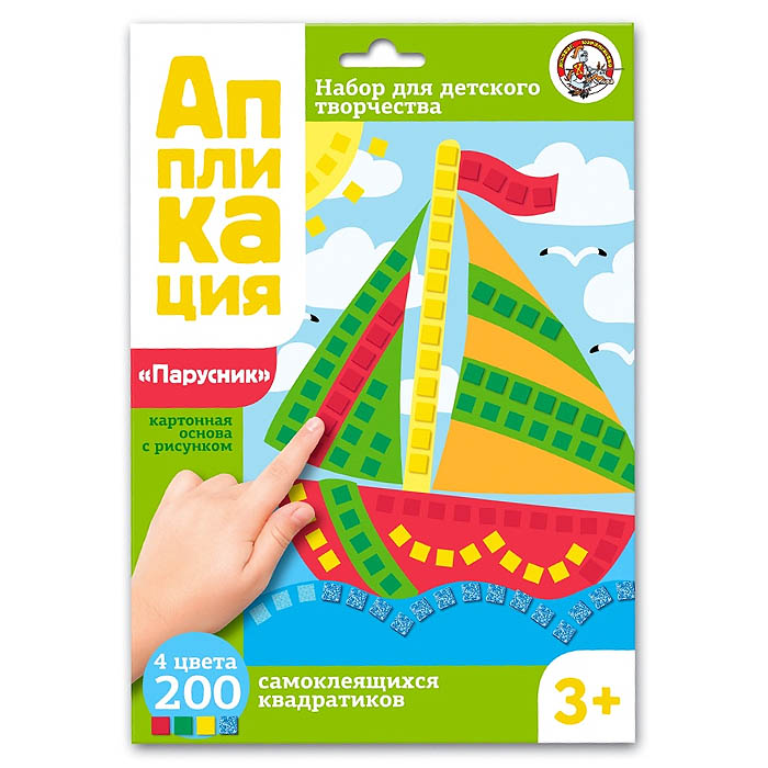 Набор для детского творчества - аппликация «Парусник» состоит из 1 цветной картонной карточки размером 20х16 см и 4 цветных блоков. Ребенку необходимо украсить картинку объемными самоклеящимися квадратиками. Этот процесс превосходно разовьет моторику неловких пальчиков и стимулирует творческие наклонности.