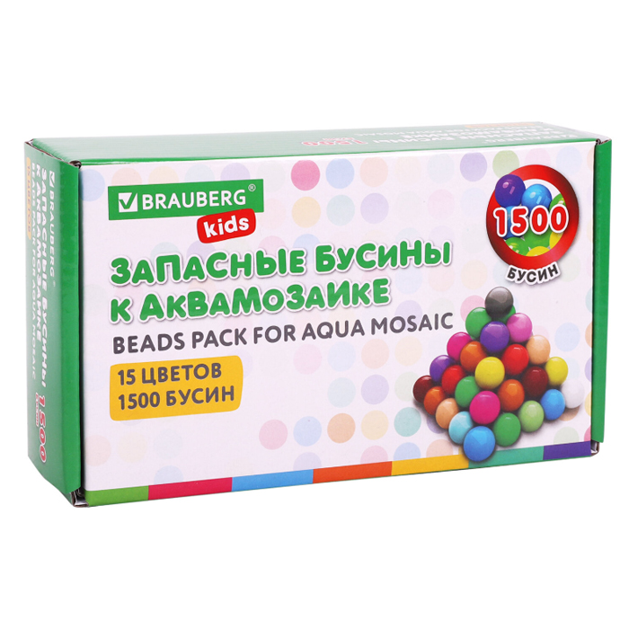 В набор входят запасные бусины для аквамозаики - 15 цветов, около 100 бусин каждого цвета, а также пластиковый контейнер с отсеками для удобного хранения бусин и 5 двусторонних карточек с рисунками.