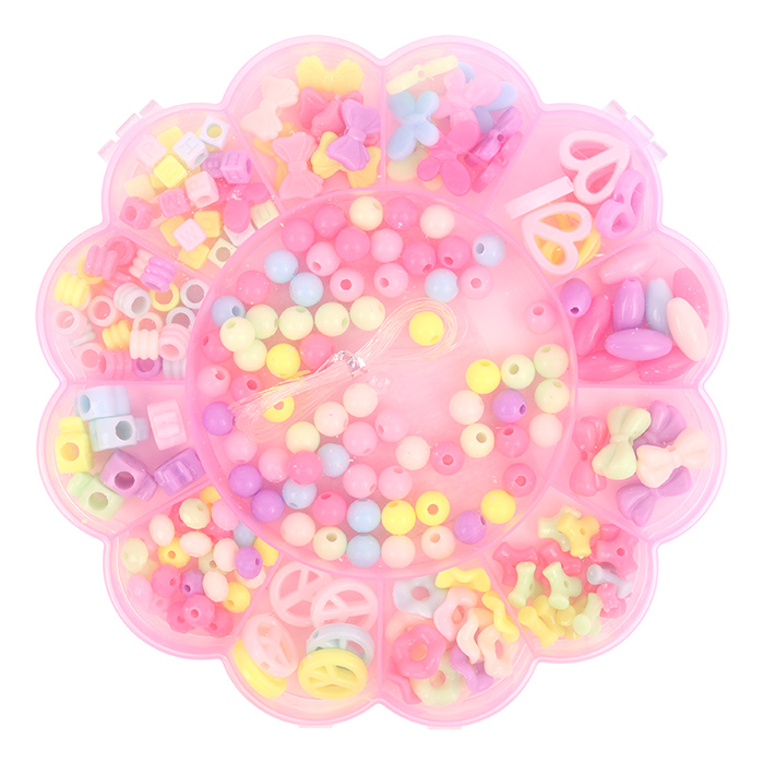 Набор для создания украшений в пластиковом контейнере в фоме цветка 13 ячеек. Для детей от 5-ти лет и старше. Развивает внимание , воображение , мелкую моторику рук. Комплектность : бусины , подвески , силиконовый шурок (2м). Упаковка пластик. контейнер в п/э 15,5*15,5*2см.