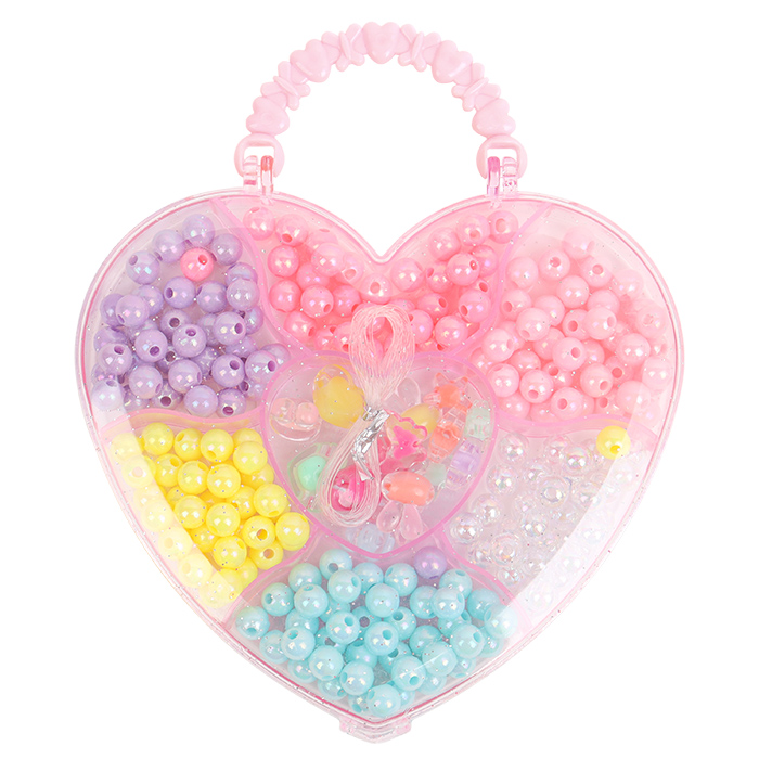 Набор для создания украшений в пластиковом контейнере в фоме сердца 7 ячеек. Для детей от 5-ти лет и старше. Развивает внимание , воображение , мелкую моторику рук. Комплектность : бусины , силиконовый шурок (2м). Упаковка пластик. контейнер в пакете из воздушно-пузырьковой пленки 14*13*2см.