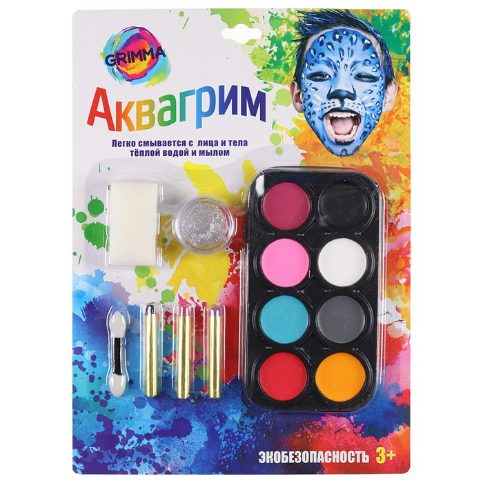 Набор аквагрима поможет украсить любой детский праздник или театральную постановку! С ним будет легко фантазировать и украшать лица рисунками, узорами, создавать любой образ. Краски легко наносятся и смываются, безопасны для детской кожи. В комплекте: 8 цветов (чёрный, белый, серый, оранжевый, фуксия, розовый, бирюзовый, красный), 3 карандаша (чёрный, фуксия, фиолетовый), 1 гель для тела и лица (серебряный), 1 спонж и 1 аппликатор. Упаковка: планшет.