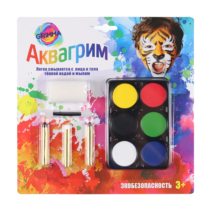 Набор аквагрима поможет украсить любой детский праздник или театральную постановку! С ним будет легко фантазировать и украшать лица рисунками, узорами, создавать любой образ. Краски легко наносятся и смываются, безопасны для детской кожи. В комплекте: 6 цветов (красный, зелёный, ярко-синий, жёлтый, чёрный, белый), 3 карандаша (чёрный, белый, коричневый), 1 спонж и 1 аппликатор. Упаковка: планшет.