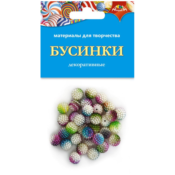 Набор для творчества. Декоративные бусинки. В наборе разноцветные круглые бусинки в форме ягод. Размер бусинок 10-12 мм, отверстие в бусинках 1 мм, что позволяет продевать нитку, леску или тонкий шнур. Набор предназначен для создания украшений своими руками - браслетов, подвесок, колье. Отлично подойдут бусинки для декорирования обложек детских книжек-малышек, фотоальбомов, создания поделок. Использование бусинок и подобных деоративных элементов широко распространено в скрапбукинге. Детям от 3-х до 5-ти лет не рекомендуем. Если есть желание использовать в творчестве подобный материал, то лучше под наблюдением родителей. Обратите внимание на другие виды бусинок, подвесок, пайеток и страз.