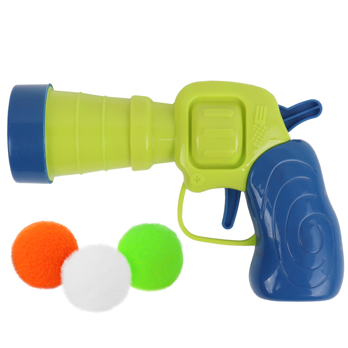 Комплектность: пистолет ( с пусковым механизмом) 13*9*3,5см., плюшевых шарика 3 шт (D2см). Ассорти цвет. Упаковка п/э 11*19*4см.