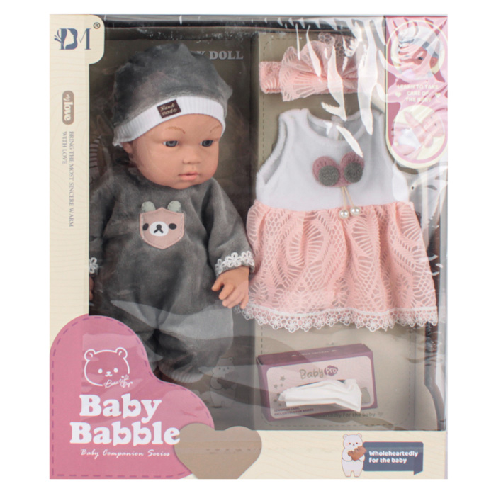 Комплектность : пупс 15*9*31см ,одежда , набор мини-салфеток. Возраст : 3+. Упаковка - коробка 29*34*10см