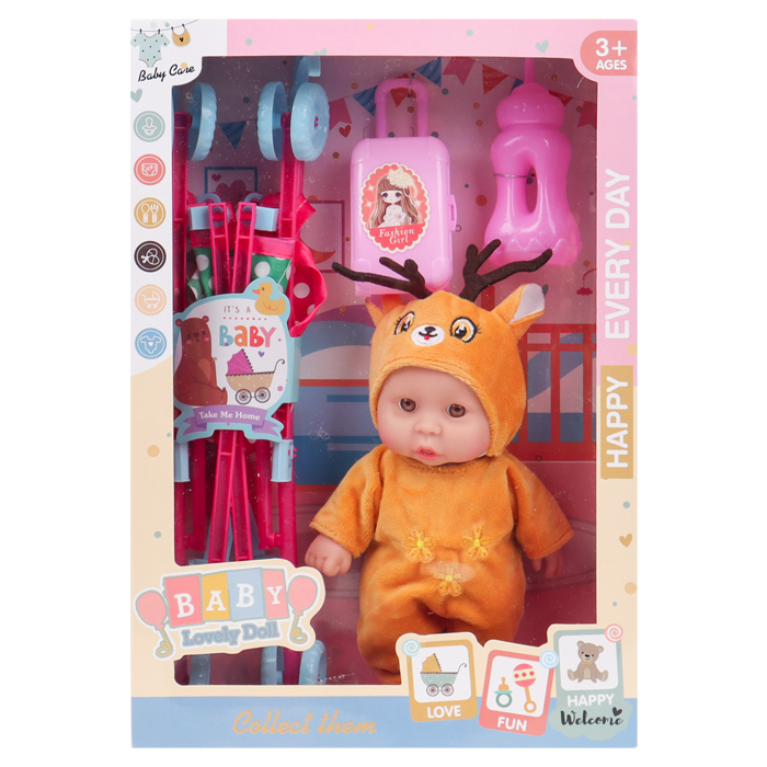 Комплектность: пупс Н20см, коляска, аксессуары. Упаковка коробка 22*32*7см.