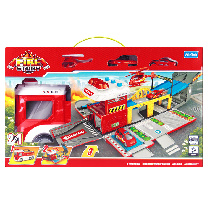 Игровой набор "Пожарная машина". Для детей от 3-х лет и старше. Для игровых целей. Изготовлен из полимерных материалов. Комплектность: пожарная машина (с эффектами звука, света, трансформируется в гараж) размер: 37х17,5х15,5 см,; верталёт (9х3,5х2 см); танк (7,5х3,5х3 см); машинка (7х3,5х2 см). Работает от батареек 2шт типа 1,5V АА (не входят в комплект). Упаковка: коробка с ручкой 45,5*28*17см.