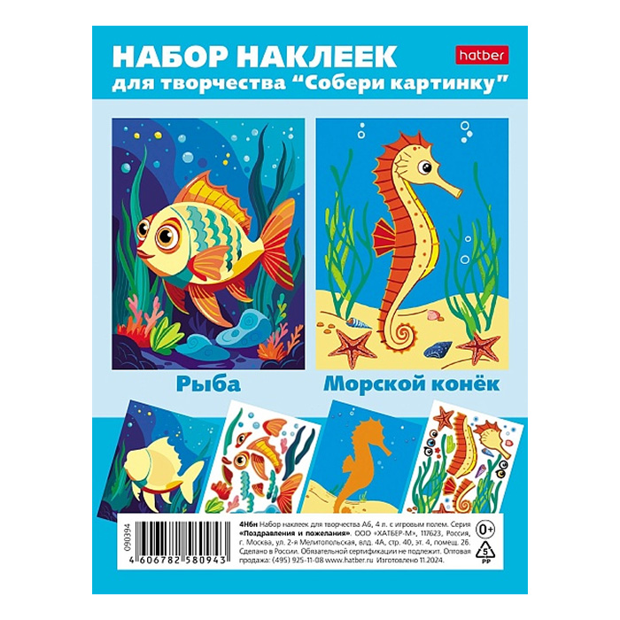 Набор НАКЛЕЕК для творчества А6ф 4л Собери картинку серия -Рыба_Морской конёк- в пакете с европодвесом