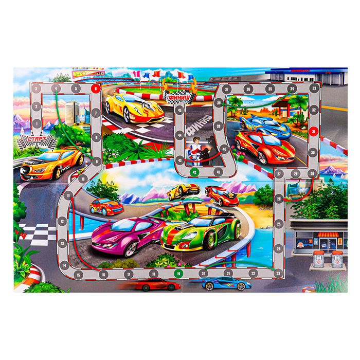 Игра ходилка Большая гонка. Что может быть интересней, чем игры с друзьями? «Большая гонка» — увлекательная настольная игра с невероятными приключениями для весёлого времяпровождения! А лёгкие правила игры осилят даже самые маленькие игроки! Настольная игра для 2-4 игроков от 3 лет. В комплекте: игровое поле (42х28,5 см), 4 фишки, кубик, инструкция. Материал: картон, пластик. Упаковка: п/э пакет с европодвесом 25,5х16х1 см.
