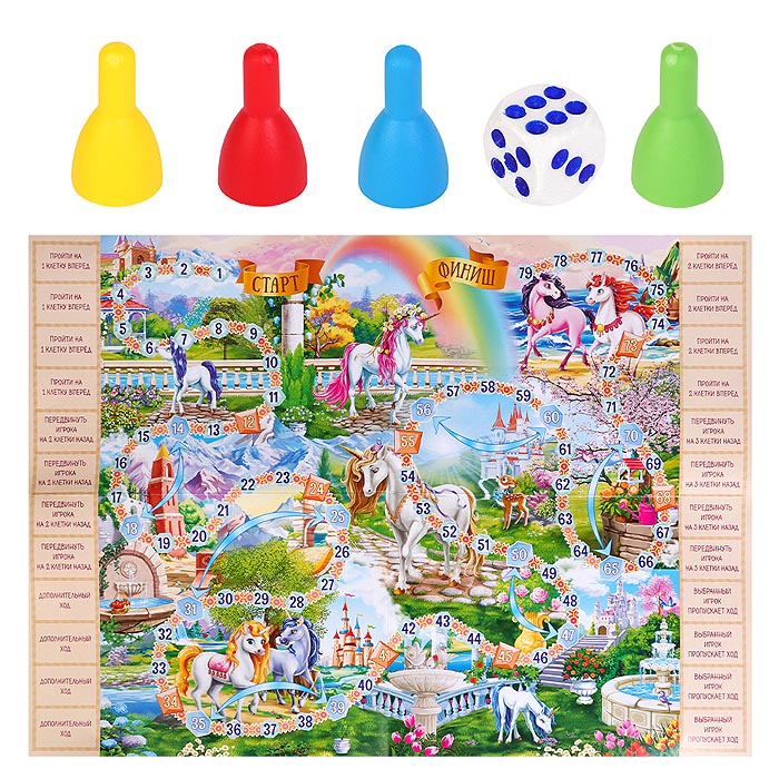 Что может быть интересней, чем игры с друзьями? «СКАЗОЧНЫЙ МИР ЕДИНОРОГОВ» — увлекательная настольная игра для весёлого времяпровождения! А лёгкие правила игры осилят даже самые маленькие игроки! Состав игры: игровое поле, фишки, кубик.