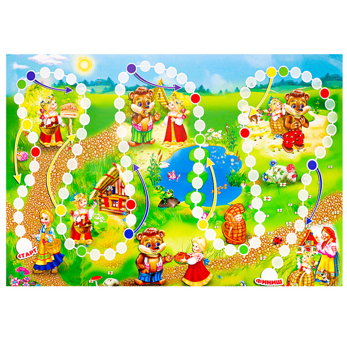 Простая и интересная игра, основанная на одной из самых любимых сказок, научит малыша разбираться в цифрах и цветах, приучит к усидчивости и полезному досугу. Уважаемые взрослые! Пожалуйста, прочитайте ребёнку сказку перед началом игры. Тогда игра покажется ещё увлекательней и интересней! Предназначено для 2-4 игроков в возрасте от 4. Состав набора: игровое поле 42*28,5 см, 4 фишки, кубик, инструкция