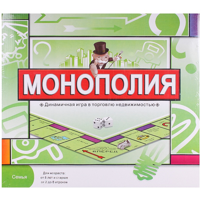 Игра "Монополия". Динамичная игра в торговлю недвижимостью. Игра включает: Игровая доска, 10 жетонов, 28 карточек на право собственности, 16 карточек "Шанс", 16 карточек "Благотворительный фонд", 32 дома, 12 отелей, 2 кубикаю Возраст 8+. Игроков от 2-8. Упаковка - 44*39,5*2,5см.