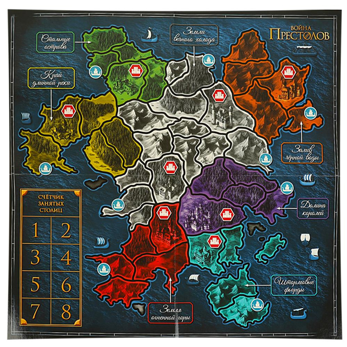 В настольной игре «Война престолов» вам предстоит примерить на себя роль правителя собственного государства. Объедините все части королевства под своей властью и станьте единственным повелителем! В первой фазе игры игроки заполняют карту королевства жетонами своих войск. Во второй фазе игры начинаются сражения.