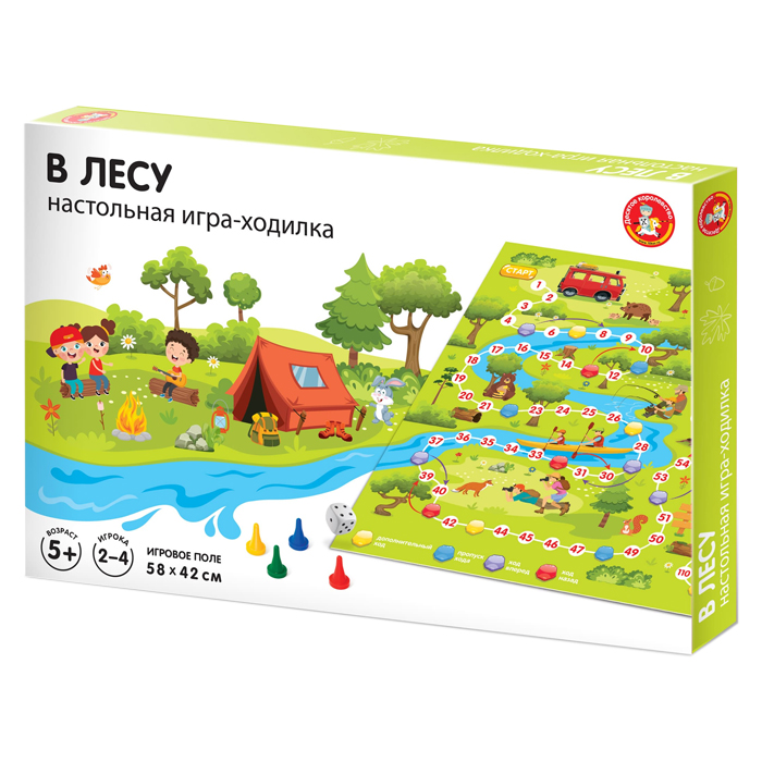 Настольная игра-ходилка «В лесу» – это игра, рассказывающая о туристическом походе в лес, о том, кого можно встретить в лесу и как правильно проложить безопасный маршрут до палаточного городка. Возможно, игрокам придется идти назад и обходить сложные участки пути. Победит тот, кто придет к финишу первым.