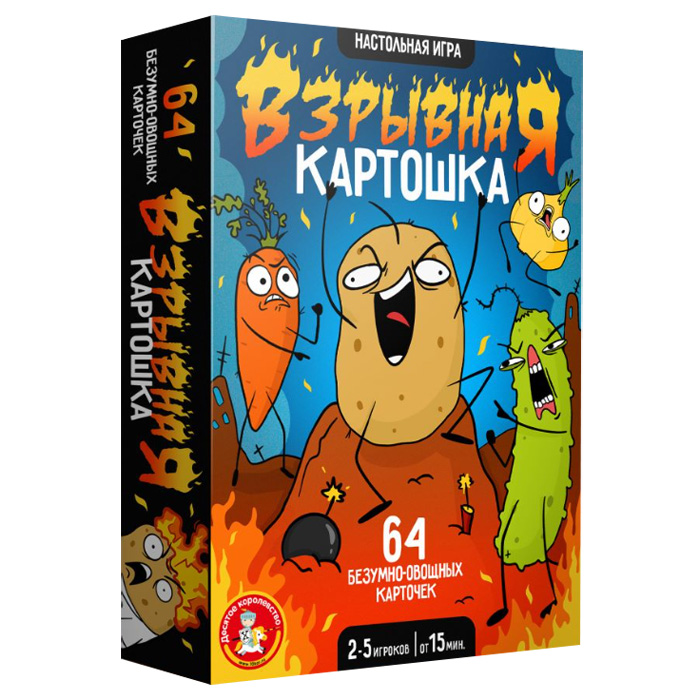 Настольная игра «Взрывная картошка» 14+ — самая адреналиновая и непредсказуемая игра для тех, кто любит острые ощущения! Один неверный ход — и вас отправят в космос без права на возвращение. Ваша задача — продержаться до конца, избегая ярости картофеля, пока остальные игроки, один за другим "взрываются" и вылетают из игры.