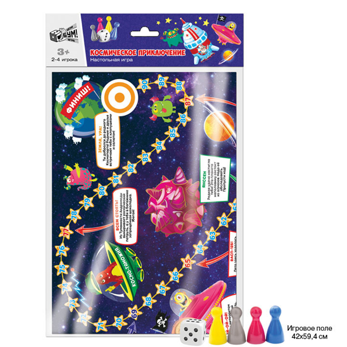 В наборе большое красочное поле размером 594/420 мм; кубик и 4 фишки необычных цветов: серебристая; малиновая; королевско-синяя и ярко-желтая.