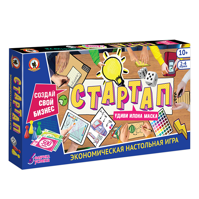 Разбогатей, удачно вкладывая деньги в смелые бизнес-идеи! В процессе игры участникам предстоит создавать и развивать уникальные Стартапы в разных областях: красота, продукты питания, генная инженерия, робототехника и многое другое. Одежда-спрей, кроссовки с ускорителем, зонтик для обуви, поводок для рыбок и многое другое – уникальные Стартапы, которые могут стать прибыльным бизнесом. Игра очень динамичная и веселая, выигрывает тот, кто первым заработает 10 млн. Эта экономическая игра научит игроков нестандартно мыслить, активно пользоваться финансовыми инструментами и совмещать риск с холодным расчетом, а заодно, игра поможет повторить таблицу умножения. Количество игроков: 2-4 игрока Возраст: 10+ Состав игры: игровое поле, купюры – 60 шт., фишки – 5 шт., кубик, правила. Материал: картон, бумага, пластмасса.