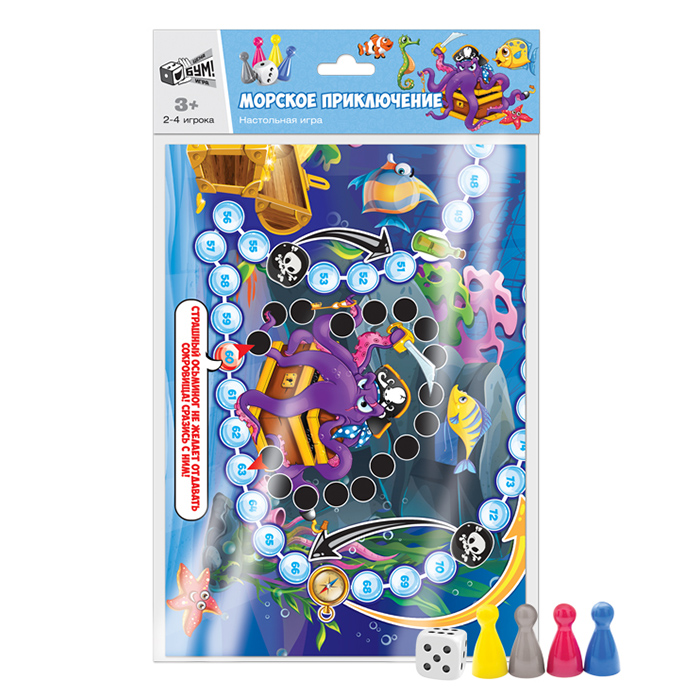 Увлекательная игра-ходилка в пакете с хеддером с 4-мя фишками необычных цветов (серебристый, малиновый, королевский синий, ярко-желтый). Увлекательная и понятная всем игра, которую легко взять с собой в поездку. Яркое большое игровое поле 594х420мм.